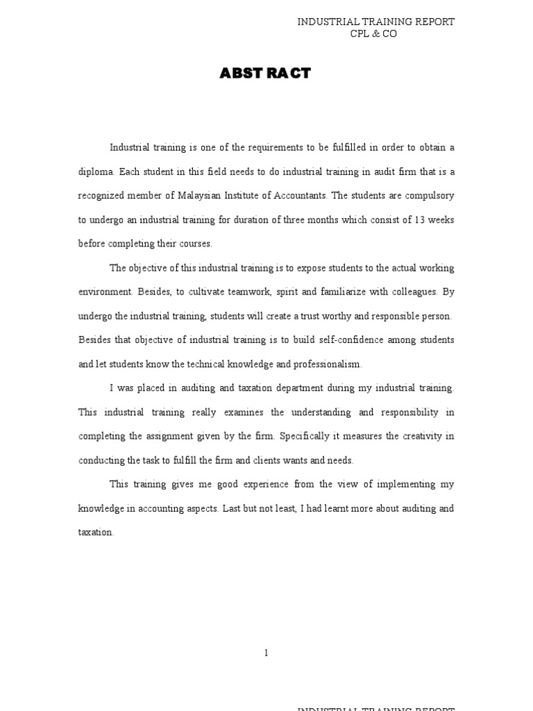 Practical training report landscape department, dewan bandaraya kota kinabalupractical report submitted in partial fulfilment of the requirement for the degree of park and amenity management (hons) faculty of architecture. Submission of practical training report the practical training report should be submitted for checking to the student s tutor by the end of september following the period of practical training. For example, in the table of contents section, simply add that you want it to only cover one page or slide, make a note if you'd like to add. For example, if you are trying to determine protein levels by spectrophotometry, you would record all the spectrophotometry readings for your standards and samples in the first table, and use the standard readings to construct a graph of protein concentration versus absorbance readings (a standard curve). Accountants play a key role in finance and can be courses are designed to teach participants as much as possible about the intricate workings of accountancy in the business world. For the student the practical training provides an opportunity to learn important skills which will help in becoming a professional of the future. There must be accounting practices in the firm; …curricular practical training is defined to be alternate work/study, internship, cooperative education, or any other type of required internship or practicum which is offered by sponsoring employers through cooperative agreements with the school. We have an example of practical training report for accounting student you could refer to. However, if a student does report employer information, the student can report it via for example, the status of the request is incorrect or the practical training dates in sevis do not match uscis' approved dates. November 5, 20xx prepared by: The report should include at least the an analysis is done weekly during the practical training, where the student analyses the assess the suitability and quality of the job as training, taking into account your previous work experience and. For example, you may write spend one hour training employees on the new handbook each week as a recommendation.