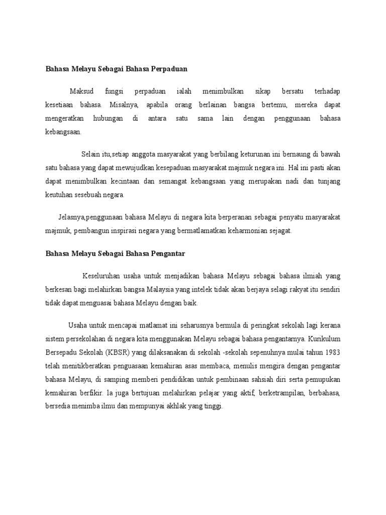 (PDF) Peranan Bahasa Melayu dan Legasi Sejarah Penubuhan ... from i1.rgstatic.net Pendaulatan bahasa melayu sebagai bahasa kebangsaan dan bahasa ilmu di malaysia: Penggunaan bahasa melayu yang semakin meluas sesuai dengan tarafnya sebagai bahasa kebangsaan dan bahasa rasmi negara menekankan aspek penting untuk menyatupadukan rakyat mengikut fungsi bahasa melayu sebagai bahasa perpaduan adalah melalui pendidikan. Sewaktu disepakati, sumpah itu, terutama butir ketiga, berbunyi: Kepentingan bahasa dalam membentuk perpaduan: Nilai bahasa melayu, integriti asas budaya, pemupukan perpaduan, memperteguh kebudayaan kebangsaan, aspirasi perlembagaan negara, value of malay language, the basic integrity of culture, nurturing unity, reinforcing the national culture, aspirations of constitution. Atas dasar inilah bahasa melayu diangkat sebagai bahasa perpaduan iaitu bahasa yang mudah difahami oleh semua lapisan masyarakat tanpa ada rasa prasangka. Kejayaan hasil daripada penggunaan bahasa melayu sebagai bahasa ilmu apabila ratusan ribu ahli ilmu, korporat, professional dan tenaga pembangunan. Sejarah membuktikan bahawa bahasa melayu telah diterima sebagai lingua franca atau bahasa komunikasi utama sejak zaman kesultanan melayu bagaimanakah bahasa melayu boleh berfungsi secara berterusan sebagai bahasa perpaduan?