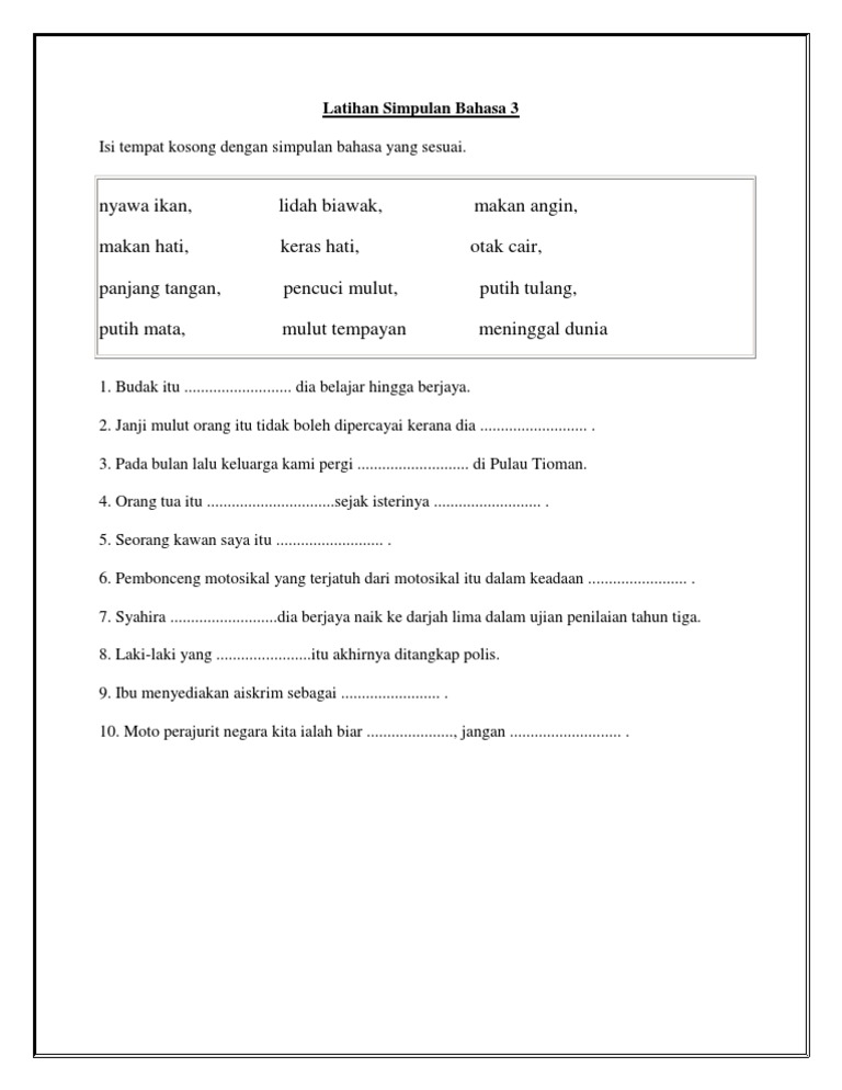 Bm tahun 1 latihan simpulan bahasa. Ini ialah video pengenalan bagi modul yang bertajuk tatabahasa: ¡¡ isi tempat kosong dengan simpulan bahasa yang berikut. Video mengenai simpulan bahasa ini sesuai digunakan kepada murid tahun 1,2 dan 3. Simpulan bahasa merupakan peribahasa melayu yang biasanya terdiri daripada dua patah kata.